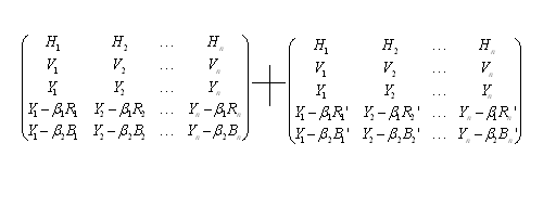 而現(xiàn)在的偽立體電視是由行向量H,幀向量V,亮度向量Y組成的三維線性空間。表達(dá)彩色信息的是由紅向量R,R',綠向量G,G',蘭向量B,B'組成的。共有H,V,Y,R,G,B,R',G',B'九個(gè)向量,通過不同的線性組合,組成的三維線性空間??捎靡韵伦笥叶€(gè)的矩陣來表示: