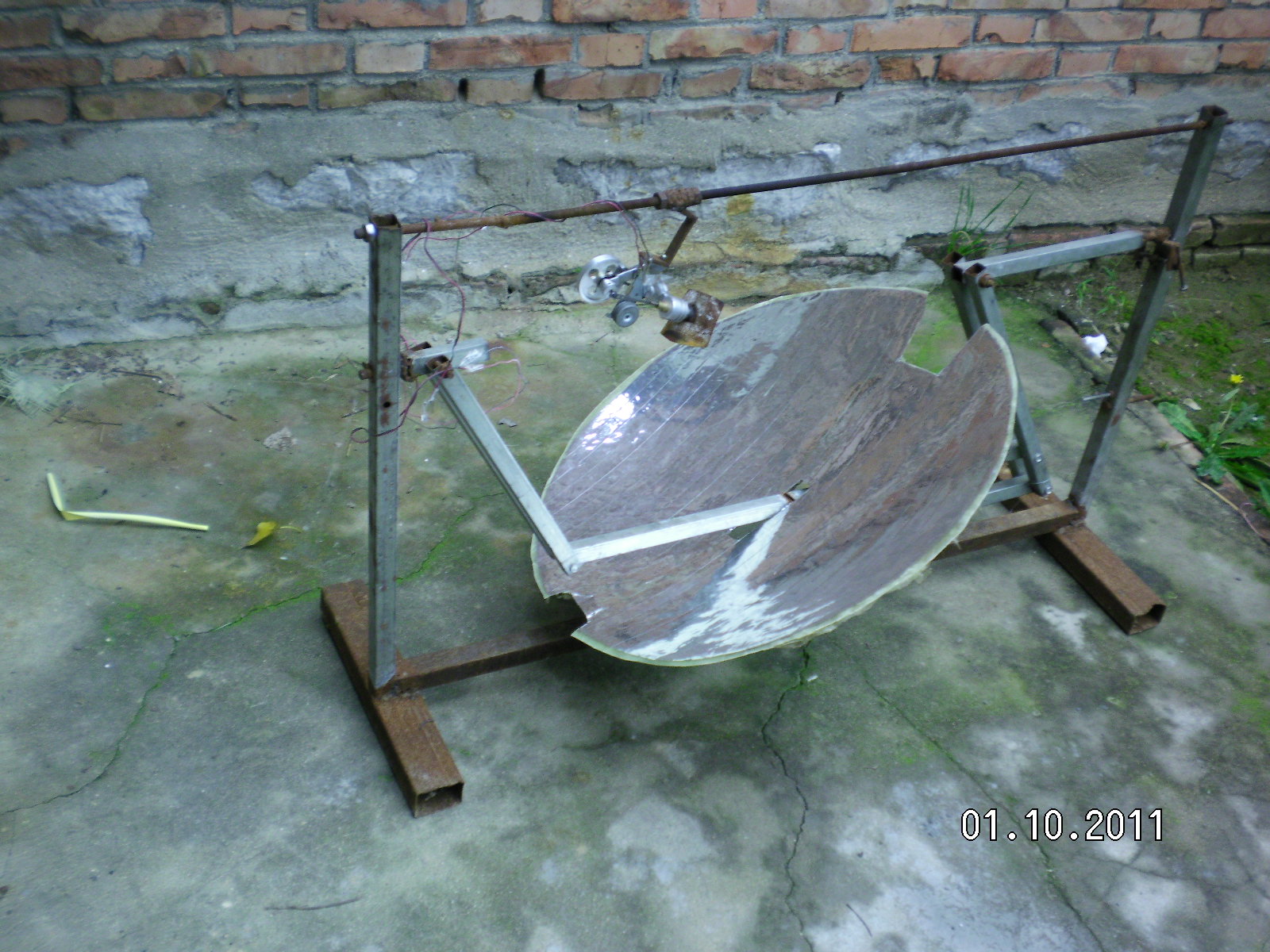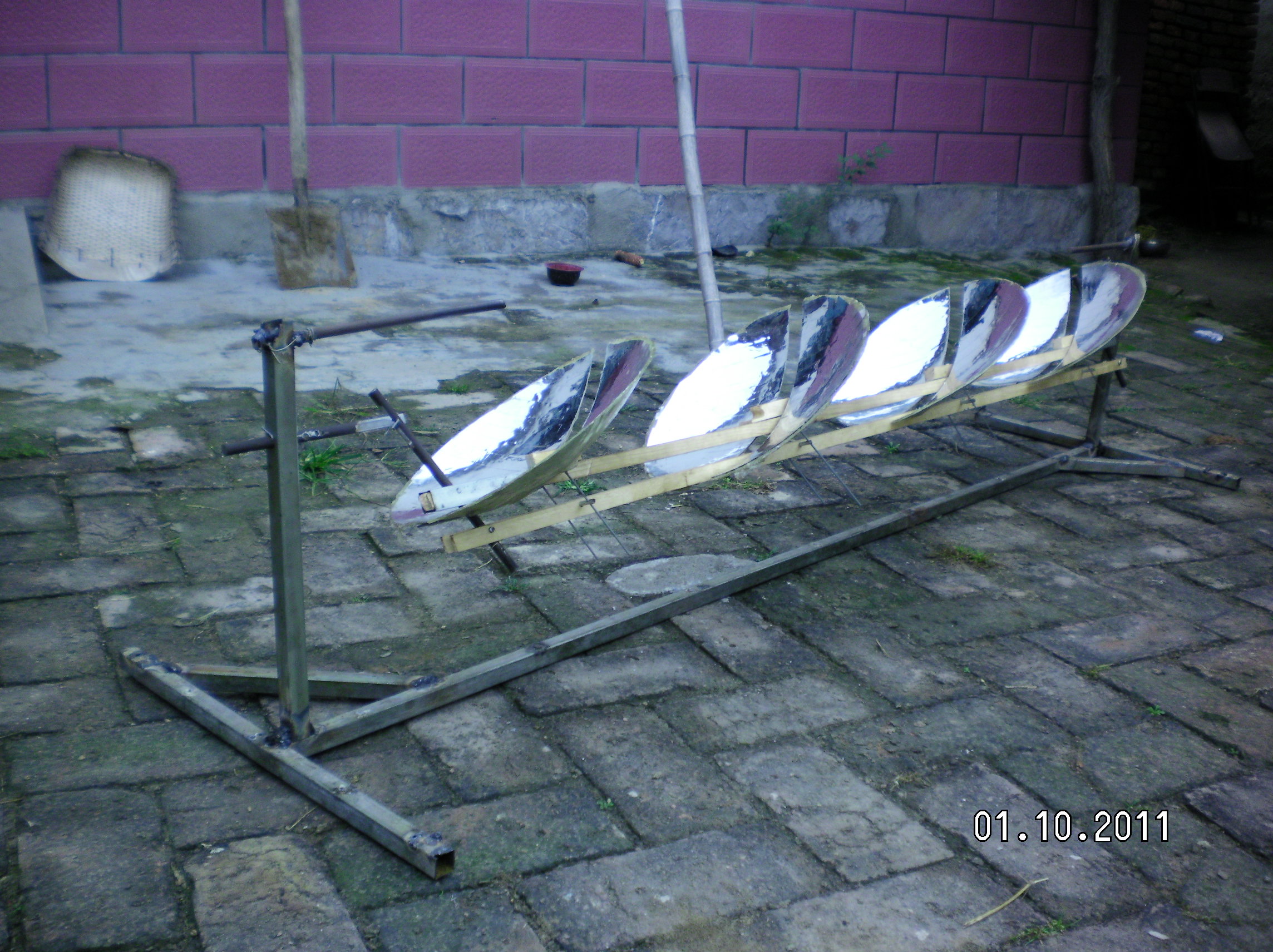 隨著全球環(huán)境惡化和日益嚴(yán)峻的能源形勢(shì)世界各國(guó)對(duì)太陽能熱發(fā)電越來越重視。現(xiàn)在最常用的太陽能熱發(fā)電系統(tǒng)主要有槽式、蝶式和塔式,槽式和蝶式的光熱部件必須隨聚光鏡做相應(yīng)的運(yùn)動(dòng),槽式各個(gè)光熱部件復(fù)雜昂貴,蝶式光熱部分只能單獨(dú)使用塔式的受熱部分出現(xiàn)故障很難維修這三種系統(tǒng)都有自己的缺點(diǎn)?;诖宋以O(shè)計(jì)了平行定焦太陽能聚光集熱發(fā)電系統(tǒng):主要有一對(duì)支柱.一對(duì)轉(zhuǎn)軸.一對(duì)動(dòng)臂.旋轉(zhuǎn)拋物面聚光鏡.一根托桿.一根平行桿.平行連桿組成將兩支柱固定在一條直線上,兩轉(zhuǎn)軸安裝在兩支柱上兩轉(zhuǎn)軸可以左右轉(zhuǎn)動(dòng),兩動(dòng)臂安裝在兩轉(zhuǎn)軸上使可以隨轉(zhuǎn)軸左右前后擺動(dòng)。托桿安裝在兩動(dòng)臂上,平行桿與托桿平行安裝在兩動(dòng)臂上,這樣動(dòng)臂.托桿.平行桿構(gòu)成一個(gè)平行凹框。在旋轉(zhuǎn)拋物面鏡原點(diǎn)安一橫軸并切去部分旋轉(zhuǎn)拋物面鏡,在橫軸兩端垂直安裝兩根平行連桿,把旋轉(zhuǎn)拋物面鏡的橫軸安裝在托桿上。在平行桿上安裝連桿軸把平行連桿與連桿軸連接在一起。所述旋轉(zhuǎn)拋物面鏡的焦距等于托桿與轉(zhuǎn)軸之間動(dòng)臂的長(zhǎng)度。將動(dòng)臂對(duì)準(zhǔn)太陽陽光就會(huì)聚焦到固定點(diǎn)上在這些位置安裝光熱部件就會(huì)得到熱能用于熱發(fā)電。這種結(jié)構(gòu)是雙軸定焦所以效率很高,抗風(fēng)性好。這種結(jié)構(gòu)可以做成很小裝在高在15-20cm的透明罩內(nèi)安裝在樓頂或樓房南墻上,為人們提供開水或蒸汽。請(qǐng)看模型照片:
