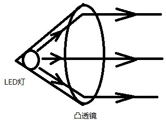 為了解決由于距離近無(wú)法看清圖像的問(wèn)題,我利用用凸透鏡把每個(gè)LED燈的光線都由發(fā)散光聚焦,但并不是聚焦為平行光,而是仍略有發(fā)散,使人眼能夠看清圖像。這樣做的目的是防止不同使用者戴眼鏡位置不同而可能發(fā)生的看不清圖像的問(wèn)題。如圖: