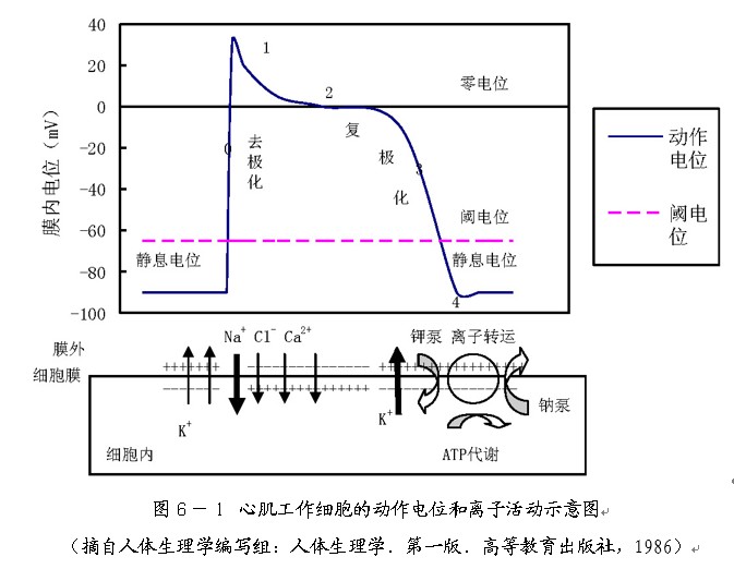 在上圖中,去極化(0期),心肌細(xì)胞受刺激后,靜息電位到達閾電位時,迅速激活鈉通道,使其開放,造成大量鈉離子內(nèi)流,動作電位迅速升高,鈉通道又迅速失活關(guān)閉;快速復(fù)極化初期(1期),鈉離子內(nèi)流停止,氯離子通透性升高,氯離子內(nèi)流,氯離子通道通透性也迅速下降;緩慢復(fù)極化期(2期),鈣離子緩慢內(nèi)流,與此同時,少量鉀離子外流,鈣離子通道的激活和失活過程均緩慢,故稱慢通道;快速復(fù)極化末期(3期),鉀離子外流;靜息期(4期),此期離子轉(zhuǎn)運活躍,即把動作電位形成期間流入膜內(nèi)的鈉離子,氯離子,鈣離子排出,又把外流的鉀離子攝回,這一過程通過心肌細(xì)胞膜上的Na+-K+泵的作用完成的,需要消耗ATP的生理過程。(本小節(jié)內(nèi)容摘自人體生理學(xué)編寫組:人體生理學(xué).第一版.高等教育出版社,1986)