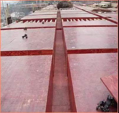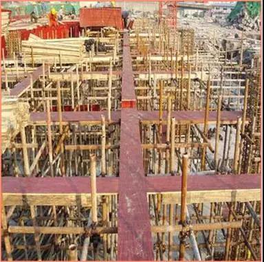 樓板模板:模板支撐體系經(jīng)過嚴格驗算,并履行審批手續(xù),確保支撐體系的剛度、強度及穩(wěn)定性。嚴格控制模板起拱高度,跨度大于或等于4m的梁板按2/1000起拱??缍?.4m樓板按1.5cm起拱。