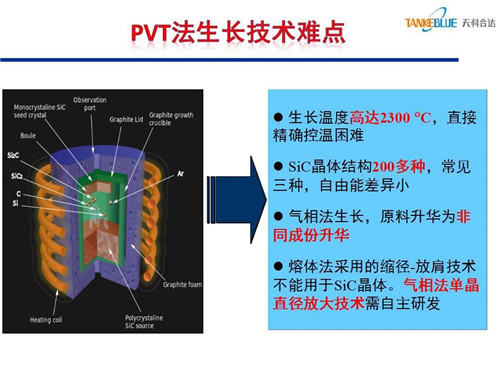 PVT法生長碳化硅存在以下技術難點,一是晶體生長溫度高達2300℃,直接精確控溫困難;二是很難獲得單一的碳化硅晶體結(jié)構;三是生長時原料易升華為非同成份其他物質(zhì);四是熔體法采用的縮徑-放肩技術不適用于氣相法碳化硅晶體生長,氣相法單晶直徑放大技術需自主研發(fā)。