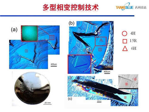 碳化硅晶體生長時如果臺階過寬,晶型沿 [0001] 方向的排列信息反應不出來,會在臺階上自發(fā)成核,發(fā)生晶型轉(zhuǎn)變。研究發(fā)現(xiàn),當晶體表面不光滑、不平整時,易發(fā)生多型相變,4H會發(fā)生6H和15R相變。另一方面晶型轉(zhuǎn)變與生長室氣氛相關,通過控制生長室氣氛解決了多型相變技術。