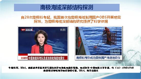 在南極地區(qū),我國有二處陸上地震臺站。在第28次南極科考時投放了海底地震儀,過了一年,在第29次南極科考船去那片海域回收時,因那片海域結冰,沒法回收。根據(jù)設計,海底地震儀最大留海時間為一年,大家都擔心失掉這兩臺儀器了。可喜的是,又過了一年那片海域已經(jīng)沒有冰了,在回收時,海底地震儀竟然浮到海面,這是在海底記錄時間最長的一次試驗。也為南極海域深部結構研究提供了科學依據(jù)。