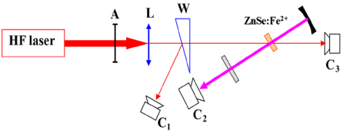 但是Fe2+:ZnSe激光器的實(shí)現(xiàn)也存在一個(gè)難點(diǎn),即在室溫下難以實(shí)現(xiàn)激光輸出,這是由其自身的能級(jí)特點(diǎn)所決定的。目前電子所采用自行研制的脈沖HF激光器泵浦Fe2+:ZnSe晶體,取得了比較好的效果,在室溫下實(shí)現(xiàn)了脈沖能量高達(dá)80 mJ的激光輸出。實(shí)驗(yàn)光路如圖2-11所示。實(shí)驗(yàn)未采用垂直入射泵浦方式,而采用小角度斜入射的泵浦方案,解決了雙色鏡鍍膜難的問(wèn)題。