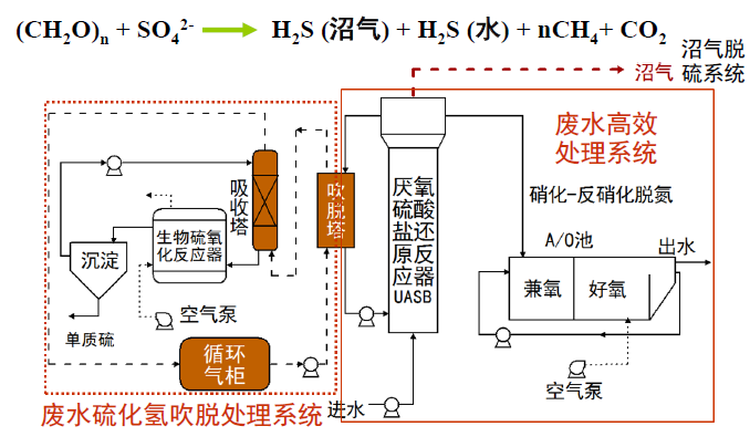 硫酸鹽還原階段;含氮/硫有機廢水首先進行硫酸鹽還原反應(yīng),在硫酸鹽還原菌和產(chǎn)甲烷菌的作用下,完成硫酸鹽還原和大部分COD的去除;