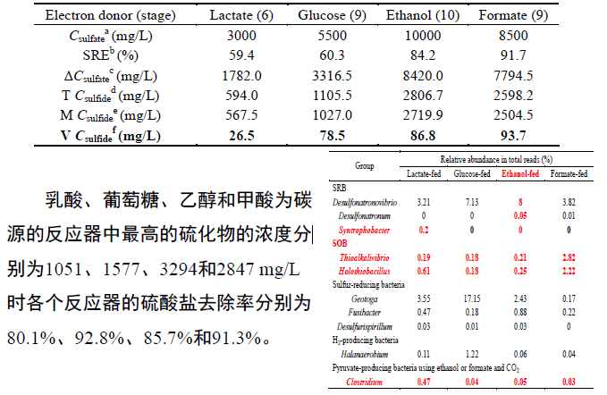 我們將嗜鹽嗜堿脫硫脫氮微生物應(yīng)用到實驗室小試煙氣脫硫系統(tǒng)中,并選擇不同碳源作為電子供體時其最佳耐受硫化物濃度以及硫酸鹽去除效率(圖1-11)。結(jié)果發(fā)現(xiàn),乙醇為碳源是可耐受的硫化物濃度可高達3000 mg/L以上,硫酸鹽的去除率在90%左右。更多內(nèi)容見下表。