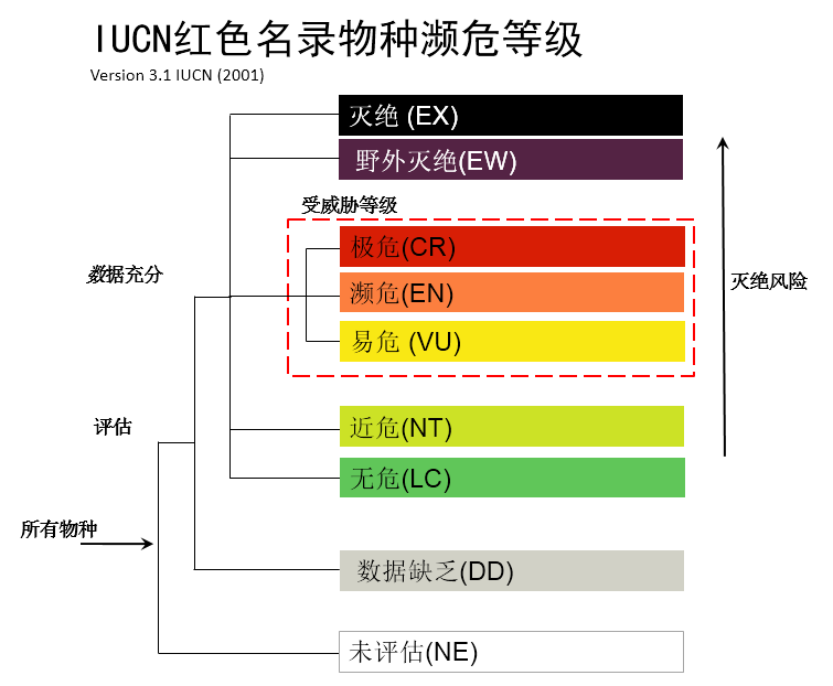IUCN自20世紀60年代成立之日起,就設立了物種生存委員會(SSC),開始編制和印刷《IUCN瀕危物種紅皮書》,后來隨著評估物種的增加,印刷版逐步發(fā)展為網絡版的《IUCN瀕危物種紅色名錄》,定期編制發(fā)布。IUCN/SSC研究制定了《IUCN物種紅色名錄瀕危等級和標準》,根據物種的種群數量和分布情況等,評估其生存狀況,確定其瀕危等級。IUCN瀕危物種等級標準分為“有評估數據”和“數據缺乏”兩類,“有數據評估”中又分為“滅絕”、“野外滅絕”、“區(qū)域滅絕”、“極危”、“瀕?!薄ⅰ耙孜!薄ⅰ敖!焙汀盁o?!钡?個級別,從“無?!钡健皹O?!?,滅絕風險逐步上升,瀕危等級逐步增加。瀕危等級標準有5個指標,分別是種群下降、有限地理分布區(qū)、下降小種群、非常小或非常有限的種群、以及模型模擬等量化分析,根據這些指標的數量閾值,來評估物種的瀕危等級。