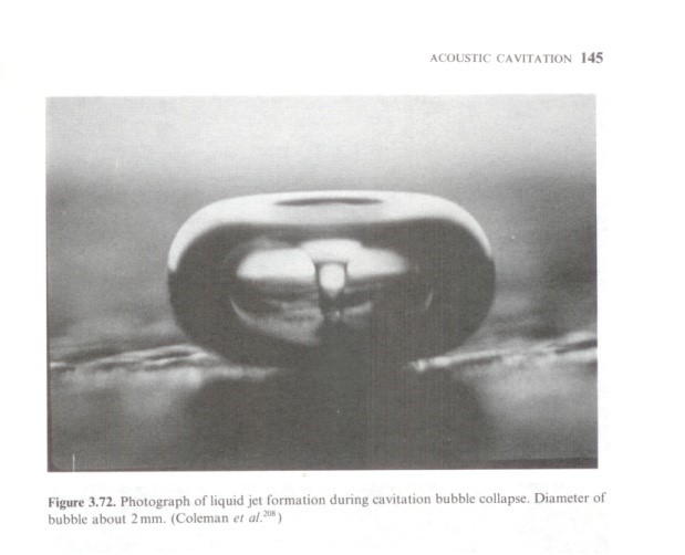 再解釋一下氣泡的潰滅。氣泡的潰滅與氣泡的破滅是完全不同的過程。氣泡的潰滅是指氣泡由大變小,最后變沒的過程,這不同于氣球由小到大最終破滅的過程。破滅產(chǎn)生不了高溫、高壓,只有潰滅才能產(chǎn)生高溫、高壓。我們講氣泡的潰滅,有的人叫湮滅,有的人叫塌縮等等,這是學(xué)術(shù)上的不同說法。