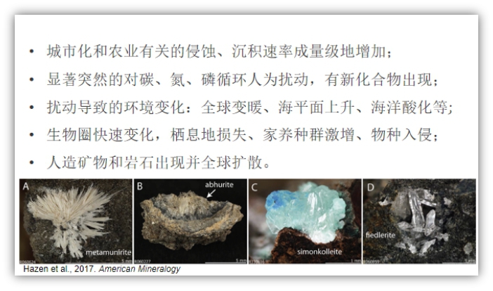 國(guó)際地層委員會(huì)的人類(lèi)世工作組工作了10年,總結(jié)了一些現(xiàn)象,如城市化和農(nóng)業(yè)的侵蝕、沉積速率成量級(jí)地增加,顯著而突然的對(duì)碳、氮、磷循環(huán)的人為擾動(dòng),產(chǎn)生一些新的化合物,使得生物圈出現(xiàn)快速變化、棲息地的損失帶來(lái)植物多樣性的降低、馴化生物種群大規(guī)模增加,人類(lèi)的遷徙活動(dòng)等等。