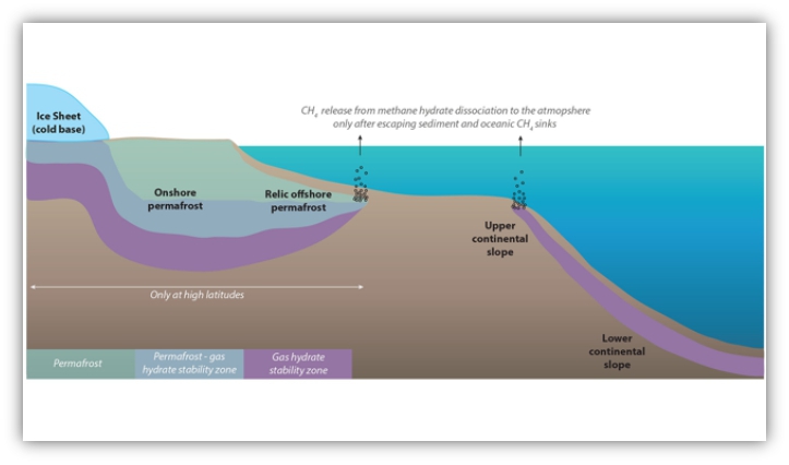 全球變暖,海洋中,深度在2000米以?xún)?nèi)的海水升溫,將導(dǎo)致在陸坡上存在的可燃冰(固態(tài)甲烷水合物)釋放,空氣中的甲烷會(huì)迅速氧化成二氧化碳,使二氧化碳濃度急劇增加。
